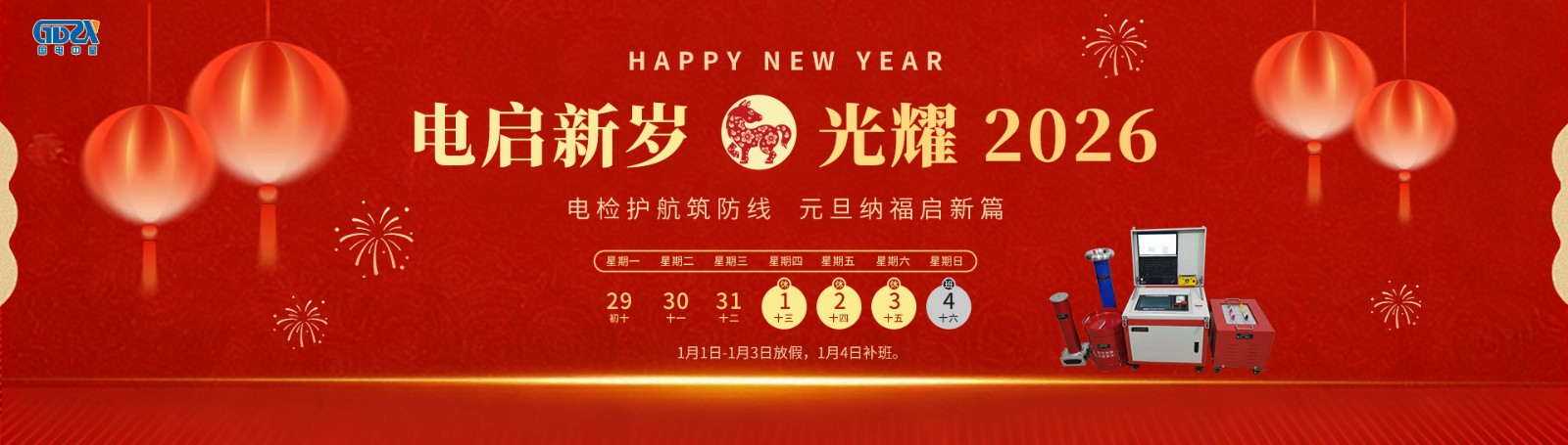 元旦鐘聲送吉祥,喜迎新年新氣象!根據(jù)國家節(jié)假日安排,結(jié)合公司實際情況,2026年元旦節(jié)放假安排如下:放假時間:2026年1月1日-1月3日放假,共3天。1月4日(星期日)正常上班。如有業(yè)務事宜請與相關業(yè)務人員聯(lián)系,相關聯(lián)系方式如下:1、產(chǎn)品和服務咨詢熱線:400-0828-027 / 132941535862、電氣試驗技術咨詢熱線:186071457333、售后服務專線:027-65526006萬象更新迎元旦,愿您新年新起點,事業(yè)順遂,諸事皆圓!——【武漢國電中星...